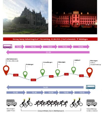 Am 2. April 2026 - genau am Geburtstag des Herzogs - möchten wir mit euch von seiner Sommerresidenz Schloss Altenstein (Bad Liebenstein) zu seinem Wohnsitz Schloss Elisabethenburg (Meiningen). Die Strecke entspricht einer Marathondistanz und kann als Einzelstarter/in, 2er-Staffel oder 5er-Staffel absolviert werden.